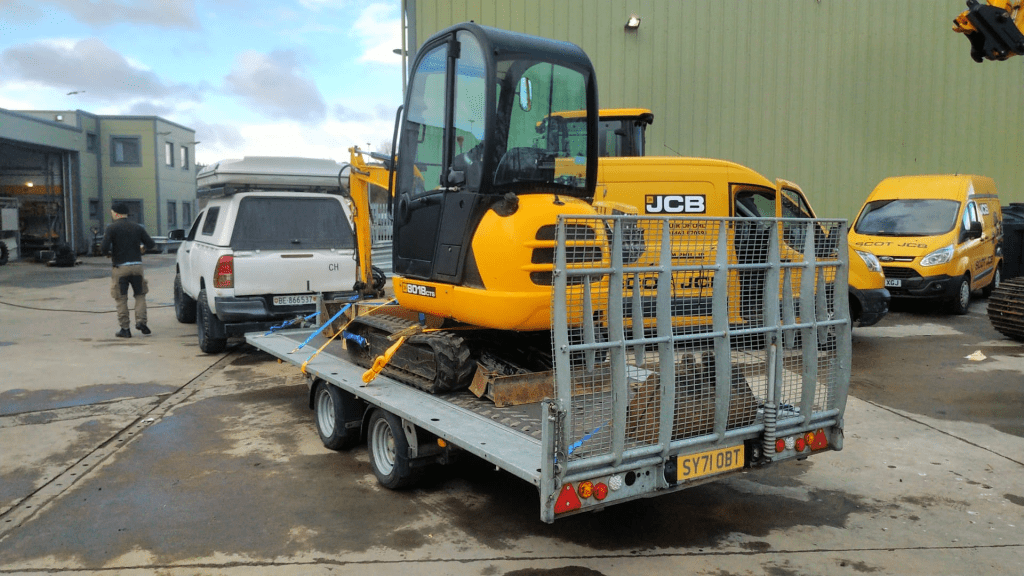So, on the 8th of April we went to the JCB Scot depot in Muir of Ord to pick up our digger. But before we could actually do that, we had to visit the cool guys at Farm & Forestry Equipment in Ardersier to borrow a trailer. When we finally arrived in Muir of Ord, the digger was actually there and the people on site actually sort of knew we were about to collect it. So far so good.