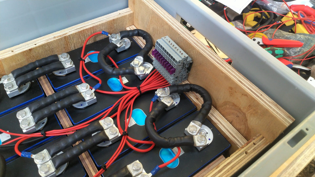 Custom battery build needed, as there is not enough space for a typical 2 * 4 cells setup behind he seats. But, only a single BMS and thus less wiring is needed. Comes with a slight disadvantage of not having native 12V from the battery. This is actually not an isse, as all our DC devices also accept 24V. Cells can better balance voltage differences across a single 8s bank.