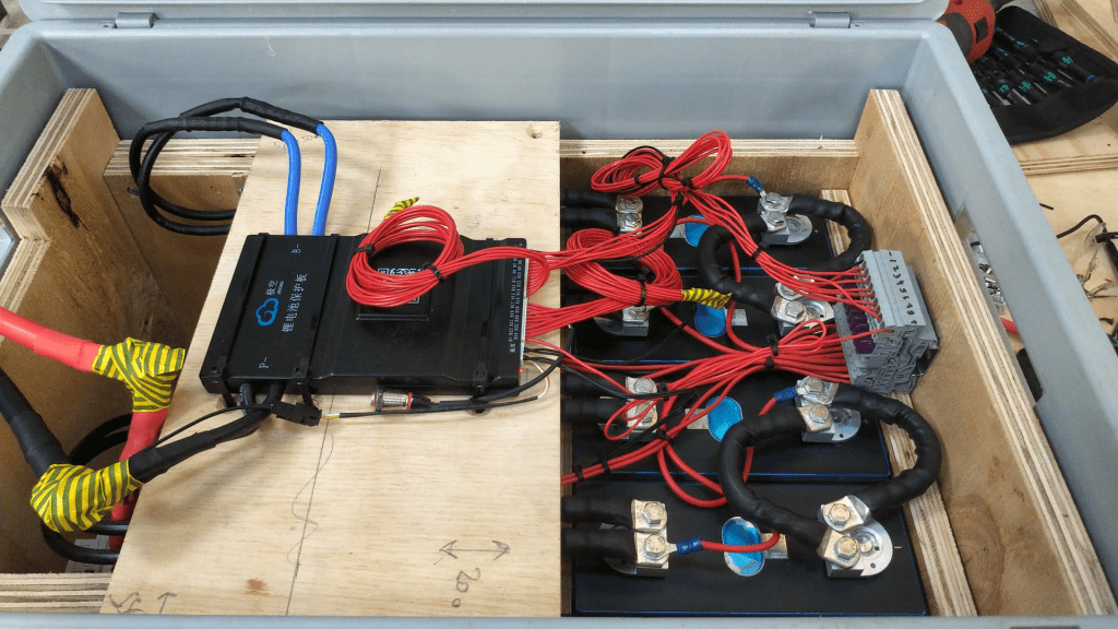 As mentioned before, due to space constraints I had to split the battery in 2 parts (with each having 4 cells). Instead of using utz RAKO boxes I used 12mm (sanded) plywood which I did not screw together but tied down with a banding/tensioning tool and a ratchet strap. With this setup, I can easily access und disassemble the cells if needed, while still having a sturdy case. Both cell blocks are connected with a (blue) Anderson SB175 connector.