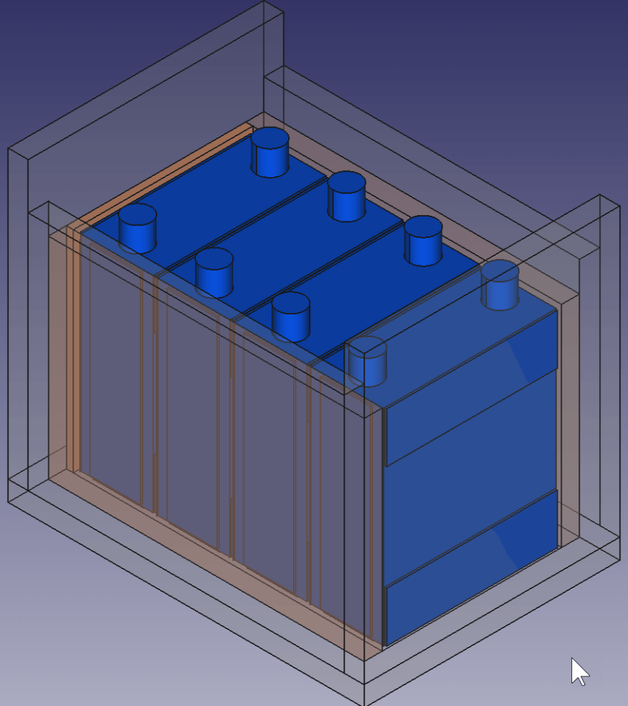 Empty utz RAKO box 600mm x 400mm x 325mmBox with batteries and electronic components on topView of frame with cells inside box