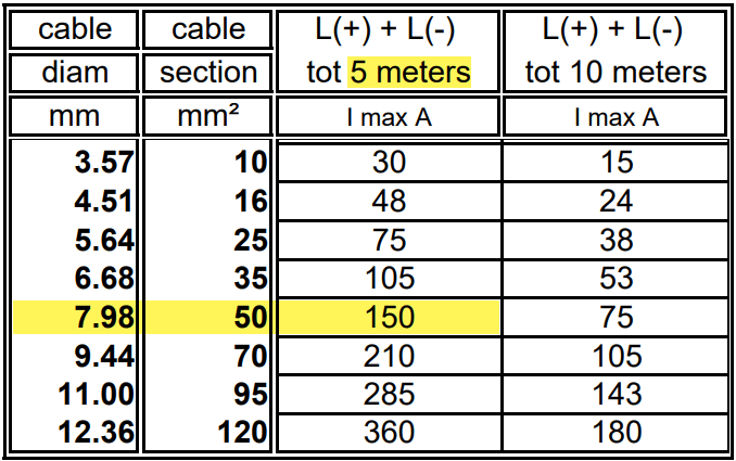 And when we look at Victron’s Recommended battery cables document, we see that they are recommending 50mm2 for currents up to 150A anyway (for cable lengths of up to 5m).