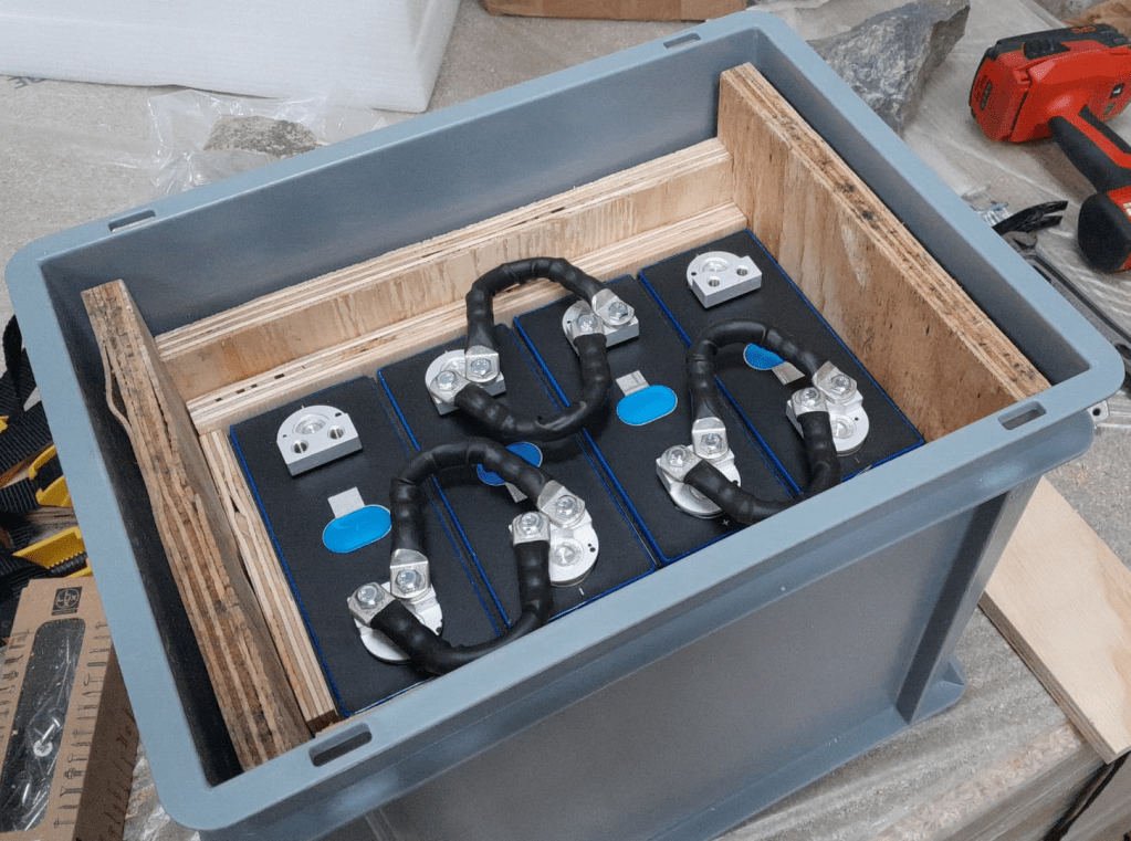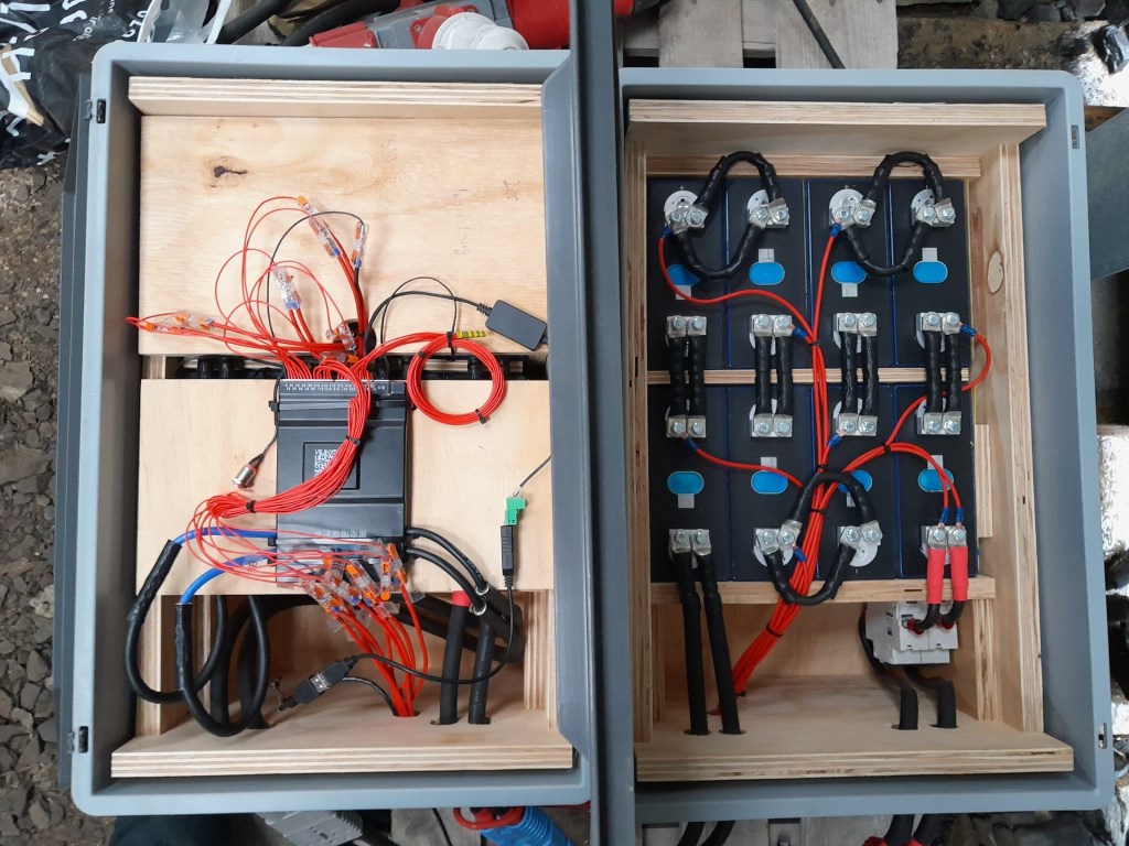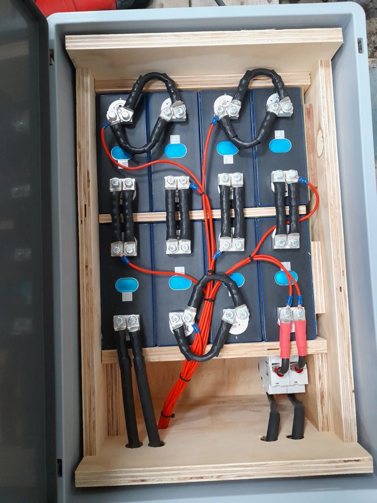 Batteries will be insulated against each other and fitted with sponge strip. Internal cabling will be fed through the lid where the BMS is mounted on. Cables to the outside (VE.Bus, 2*35mm2 DC, 2* 3-core AC) will be fed through the side wall.