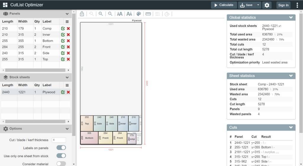 I found web site that offers help in cutting rectangles in a more efficient way that I could come up with: Cut list optimiser. The board for the case could be cut like in the image shown below.