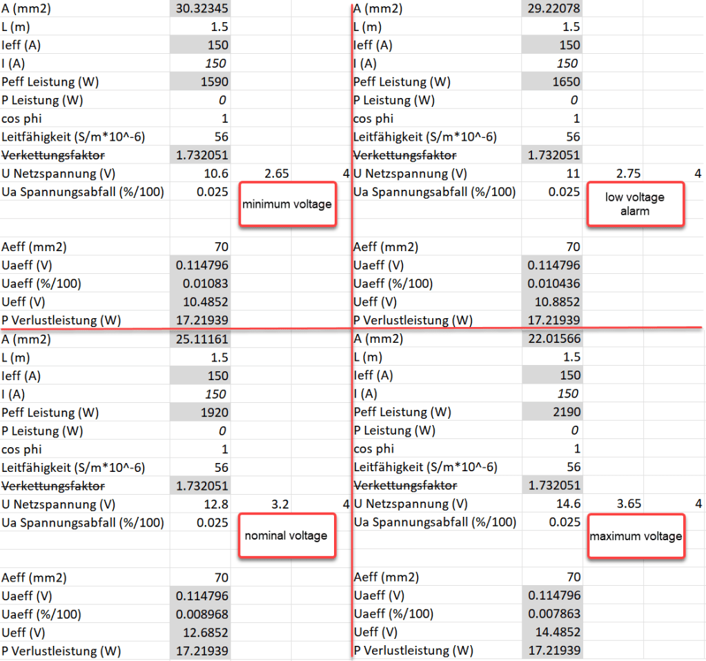 Already a cable size of 2m will lead to over 3% and 0.3V voltage drop when the cell voltage is only 4* 2.6V = 10.4V (and by default raise a “Low Voltage Alarm” on the MultiPlus). And even a cell voltage of 4* 2.75V = 11V is close to 3% and over the recommended threshold (of course, calculation is based on full inverter load of 1600VA). Besides Victron explicitly recommends a voltage drop of under 2.5% in their Wiring Unlimited document.