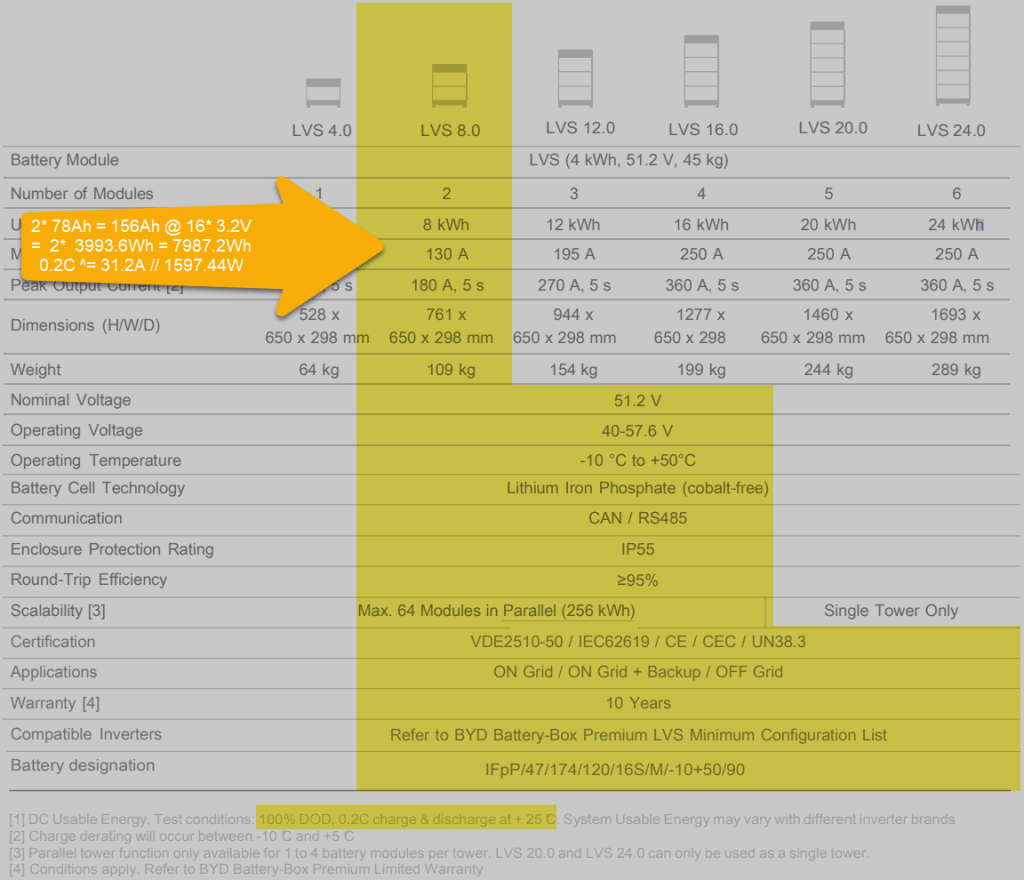 The BYD manuals state, that the lifetime of the battery can only be achieved at 0.2C, which limits a single LVS 4.0 to 798.72W (or 1597.44W for a LVS 8.0) – this is a ridiculous small amount.