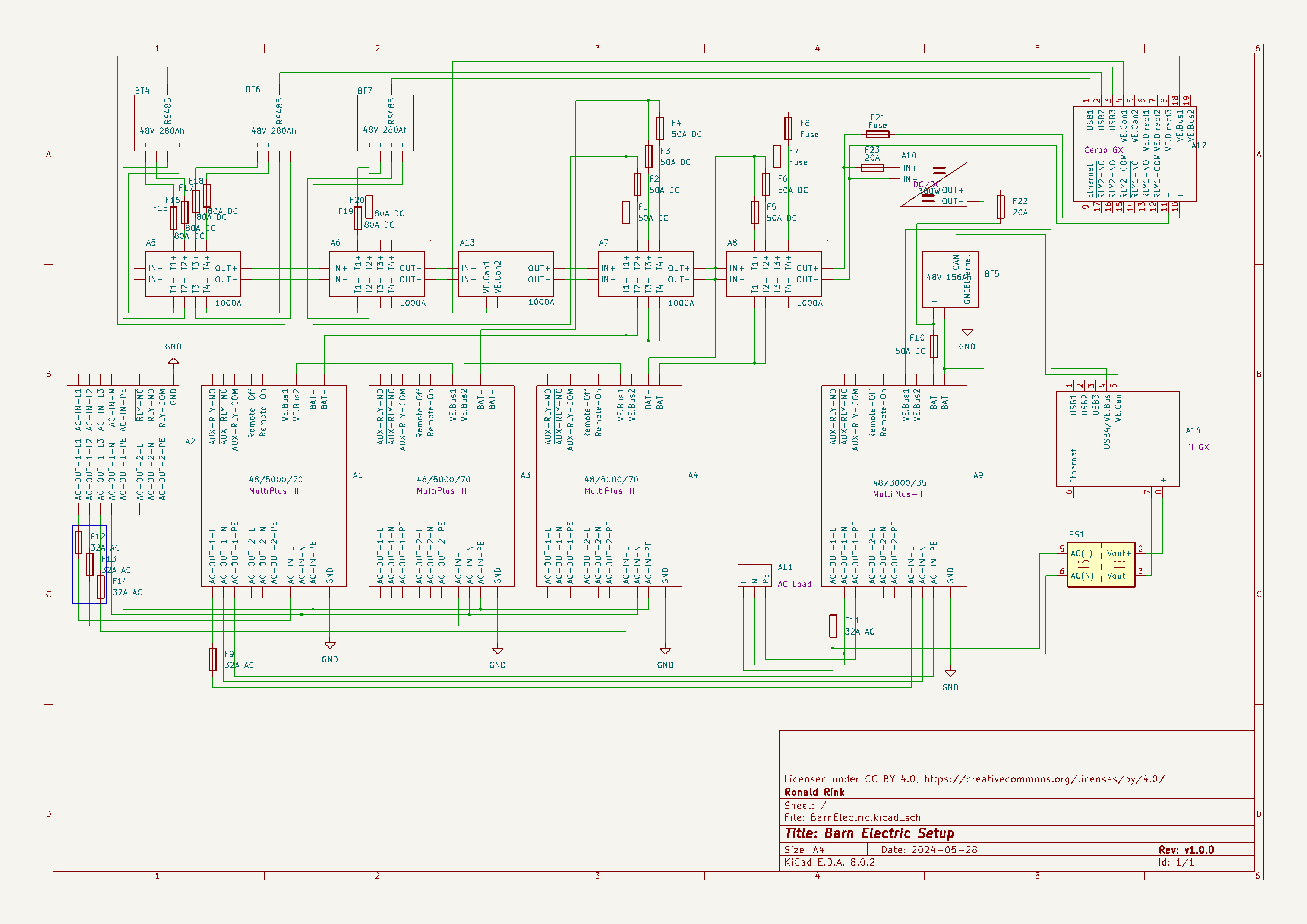 This system is the main electricity for our barn and currently consists of three batteries with an energy (often referred to as “capacity”) of 3* 14.33kWh = 43kWh (battery bank A, A1:A2 on the plan). These batteries are charged by a JCB G20QS (B1) via three MultiPlus-II 48/5000/70 inverters/chargers (B1:C2) which are by default in “Charge Only” mode. The MultiPlus-II are configured in a 3-phase configuration but only turned on when 3-phase is actually needed.