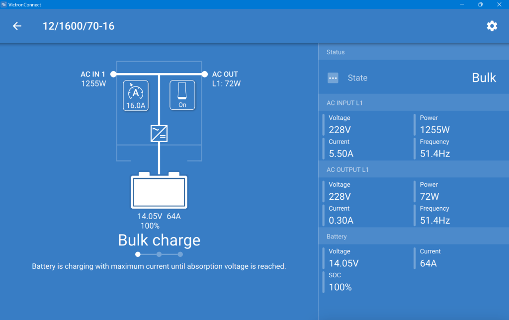 As I did not want to connect a Cerbo GX to the system, I just used the VictronConnect App. Maybe I add a VE.Bus Smart dongle later on, or I connect some GX nevertheless. Who knows … Until now, it needs a wired connection to the inverter to see its status.