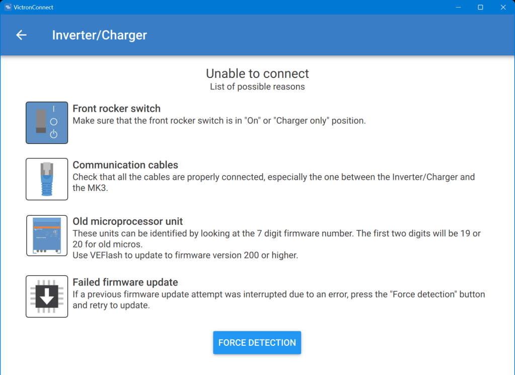 VictronConnect trying to detect the MultiPlus after the failed firmware updateDetection unsuccessful after the failed firmware update