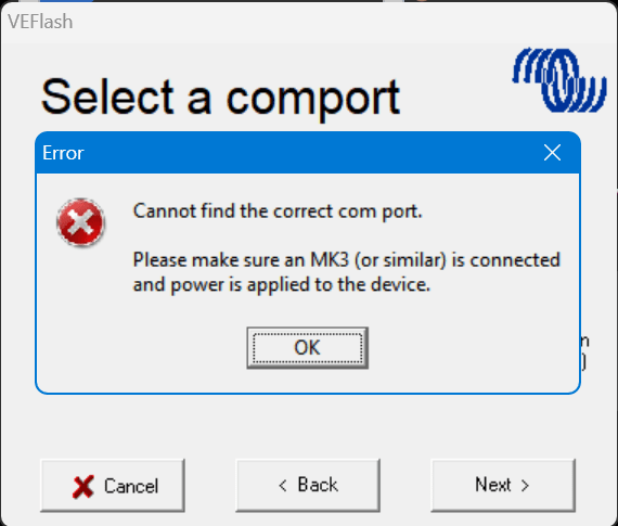So, then I resorted to VEFlash (which is deprecated and has to be selected explicitly when installing the Victron tools on Windows).