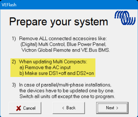 VEFlash hint at not using AC power on a MultiPlus Compact