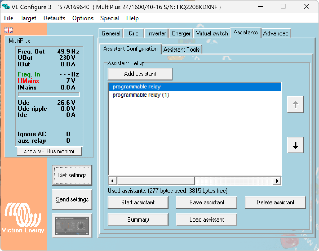 Disable Virtual Switch on MultiPlusAdd 2 Progammable Relay assistantsProgrammable Relay ON after 5 secondsProgrammable Relay OFF after 1 second