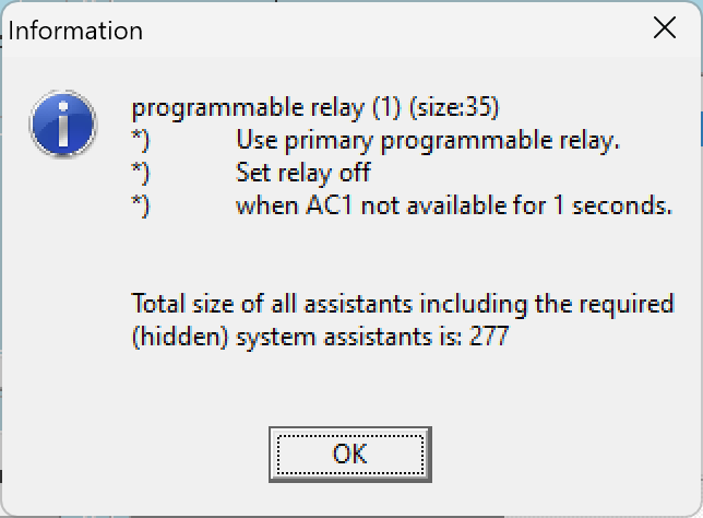Enter the MultiPlus Assistant in form of the Programmable Relay. With this, we can configure the built-in relay of the MultiPlus to open and close based on the availability of an AC input.