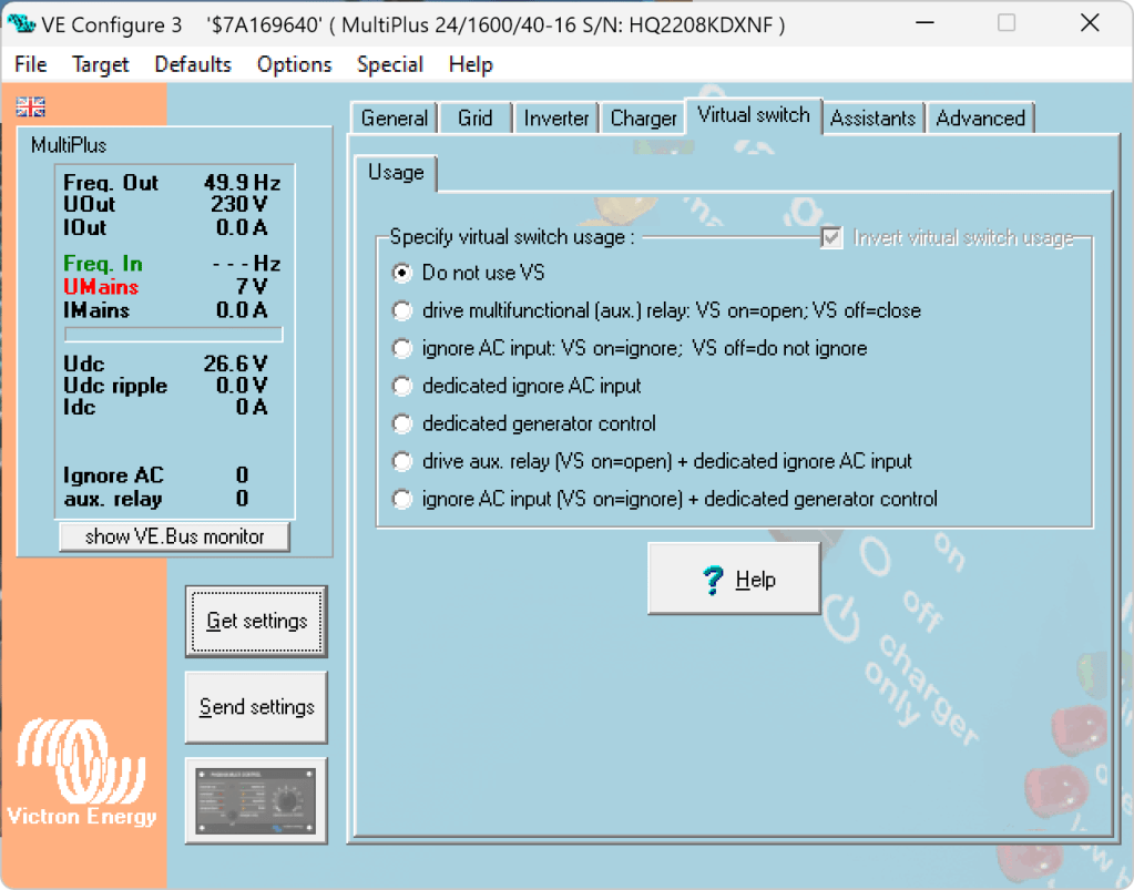 Note: we have to disable “Virtual Switch” in the MultiPlus to be able to use the MultiPlus Assistant.