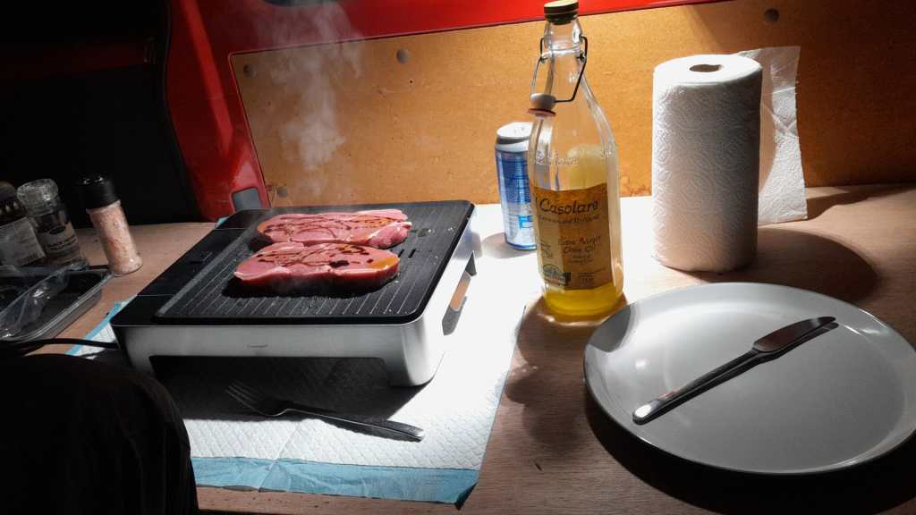 But all in all, with this table grill we now can do the BBQ inside (or outside) in our Toyota HiAce – even when we are on the move.