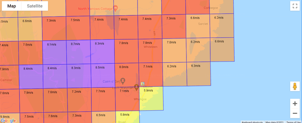 Located at the northern parts of the North Sea, near Wick, wind speed is excellent, as you can see from the map.