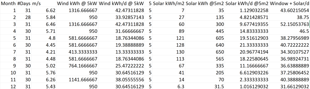 With some calcuIations from the wind and solar database, I figured out, that with a 5kW turbine and 5m2 of solar panels I could roughly produce this amount of energy over the year:
